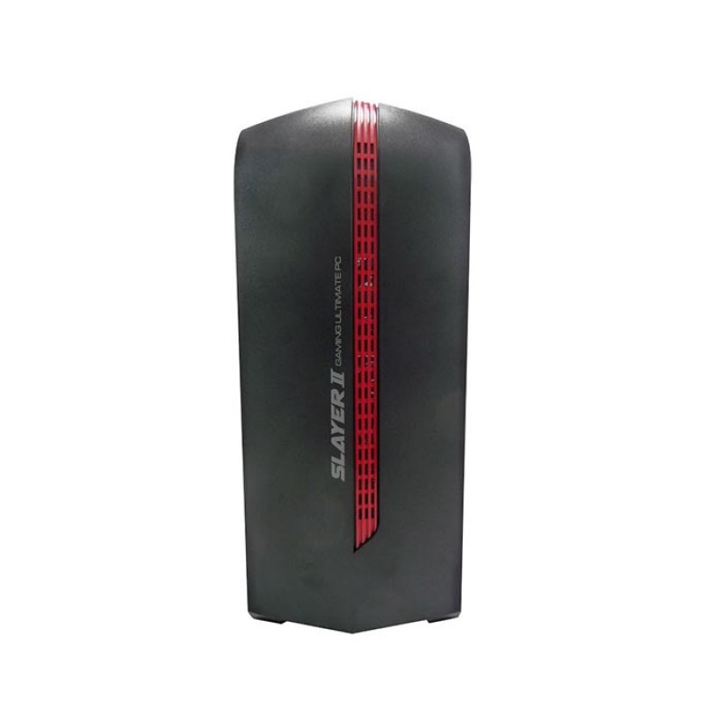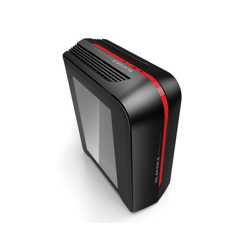 Caixa Gamer Micro ATX Slayer II em Preto com lista em vermelho, janela em acrilico, 2 de 3.5P e 2 de 2.5P, sistema de refrigeração composto por 1 ventilador de 120 mm com PWM no painel posterior, permite a instalação de mais4 ventiladores 120 mm, 2 topo, 2 frontal. Painel Superior com 2 x USB 3.0, Audio In e Out. Extrema arrumação de cabos. Suporta motherboards, Micro ATX, PSU não incluída. Dimensões: 350 x 188 x 380 mm.